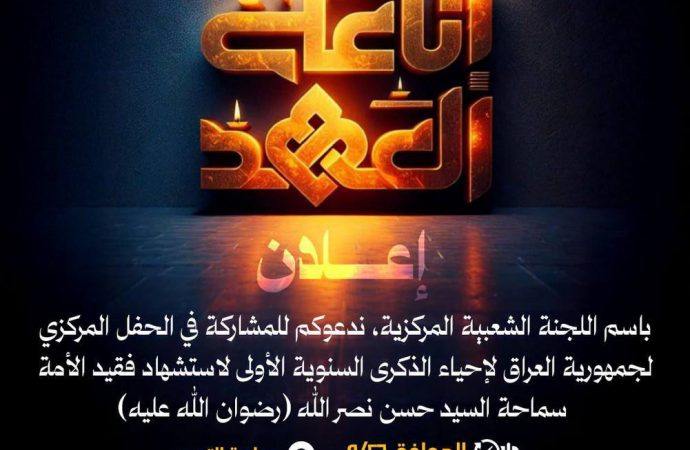 باسم اللجنة الشعبية المركزية، ندعوكم للمشاركة في الحفل المركزي لجمهورية العراق لإحياء الذكرى السنوية الأولى لاستشهاد فقيد الأمة، سمـ.ـاحة السـ.ـيد حسـ.ـن نصـ.ـر الله (رضوان الله عليه).