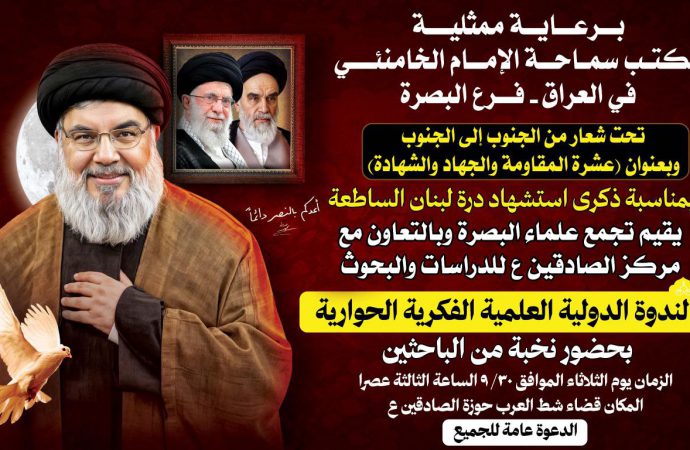 بمناسبة ذكرى استشهاد قائد المقاومة الإسلامية في لبنان سماحة الشهيد السيد حسن نصرالله قدس سره، ينظم تجمع علماء البصرة بالتعاون مع مركز الصادقين (ع) للدراسات والبحوث ندوة علمية فكرية بعنوان: “عشرة المقاومة والجهاد والشهادة”.