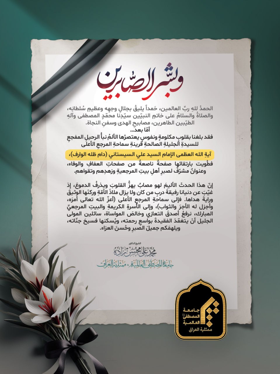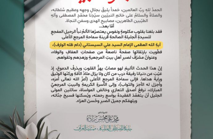 نرفعُ بخالصِ المواساةِ والتعازي لسماحةِ المرجعِ الأعلى (أعزَّ اللهُ تعالى بألمِ المصابِ أمرَه)، وإلى آلِ بيتِ المرجعيةِ العليا وأبنائِها الكرام.