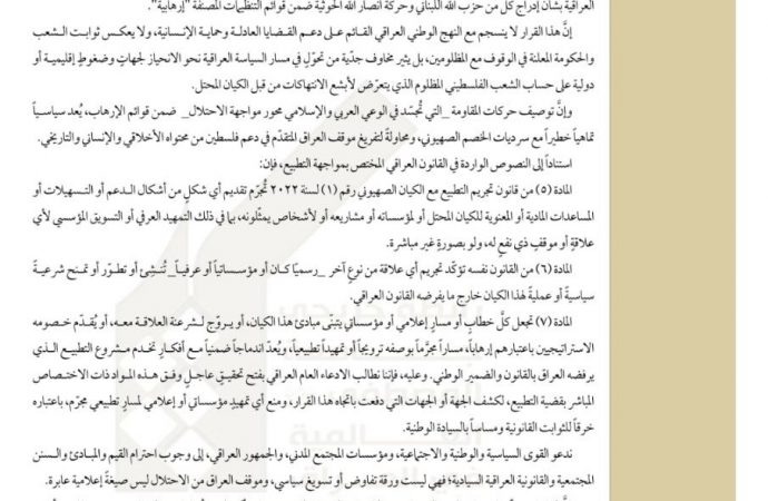 تزامناً مع ما يتعرض له شعبنا الفلسطيني من إبادة جماعية، وإصراراً على الثوابت العراقية الراسخة الرافضة للاحتلال والمشروع الصهيوني، نعلن إدانتنا الشديدة لقرار نشر “الوقائع العراقية” تصنيف كتائب المقاومة ضمن القوائم الإرهابية.